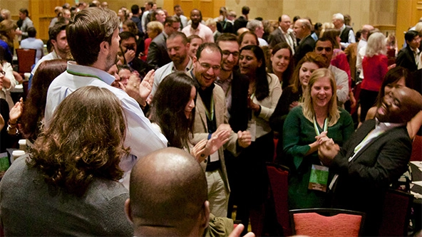 An icebreaker scene from an all-staff conference in 2016, the year DAI launched the new global employee ownership program.