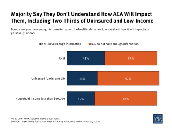 As the chart below demonstrates, most Americans have a poor understanding of how the ACA will impact them. Moreover, the nation’s 50 million uninsured are an incredibly diverse population, so we must tailor educational messaging to different demographic groups (such as Young Invincibles, older consumers, and ethnic groups). Critical areas include coverage options advising and budgeting assistance.