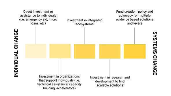 By investing at different entry points in the system, impact investors can similarly analyze different types of evidence about solutions for social or market change. The accelerator Camelback Ventures uses horizontal layering to refine strategies that support women and entrepreneurs of color. Its fellowship program addresses disparities in capital distribution and investment in companies with diverse founders by focusing on multiple solutions and measuring their effectiveness along the way. For example, the program collects qualitative feedback about the impact of coaching on fellows’ ability to develop sustainable enterprises; tracks revenue growth over time to monitor the specific impact of its capital investment for the target population; and monitors and counts fellows’ connections to industry experts and potential funding partners. After six years, Camelback has used its insight about building connections and networks to develop three distinct tracks, with curriculum tailored for entrepreneurs in education, conscious tech, and local economies.