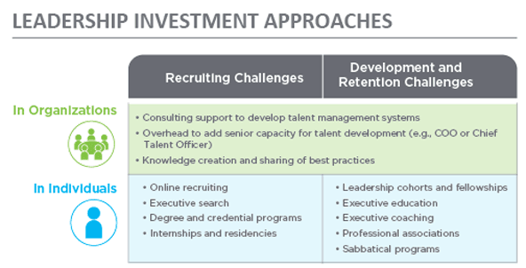 From a list of more than 1,000 nonprofit leadership investments, we categorized a number of approaches funders can use to address the root cause of any leadership challenge they uncover, including executive education and fellowships for individuals, and capacity and consulting support for organizations to better develop talent.