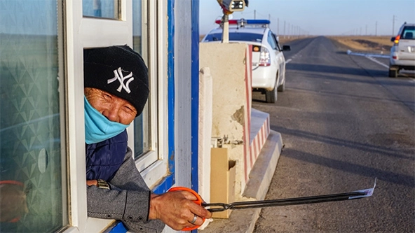Munkhbaatar Sukhee, a ticket agent at the Dalanzadgad-Bayandalai checkpoint in Mongolia’s Umnugovi province, registers vehicles and gives each driver information on coronavirus prevention. (Photo by Uranchimeg Tsoghuu)