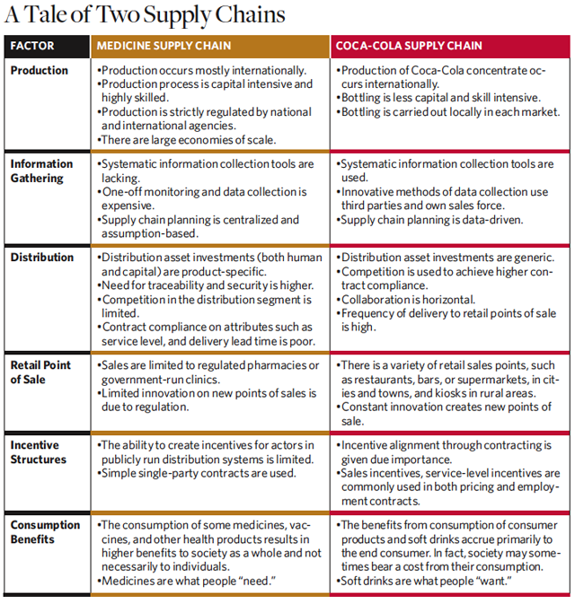 Yet these questions do not address the similarities and differences between soft drink and medical supply chains. This article compares the two supply chains in developing countries to highlight what can be learned from Coca-Cola’s distribution, what can be borrowed, and what is impossible to replicate. It also describes several new enterprises that have begun to mimic the effectiveness and efficiency of soft drink supply chains, while preserving the safety and traceability that are vital to medicine supply chains.