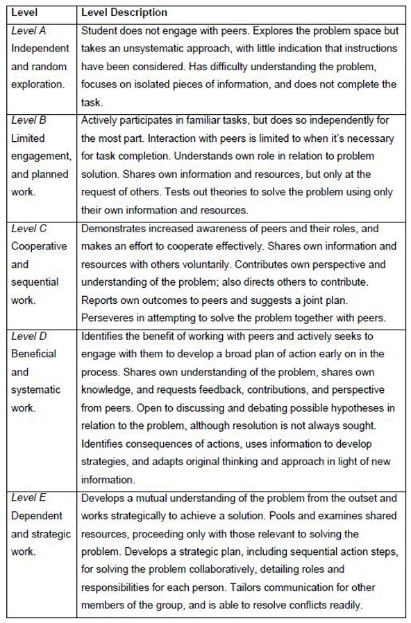 As the chart shows, novices would work independently; they would be unaware of the benefit of engaging with peers, and as a result, would not solve the problems presented. As students increase in proficiency, however, they would engage more with others and gradually realize the benefit of collaboration. Expert collaborative problem solvers would depend upon their peers; they would develop a mutual understanding of the problem and work strategically to solve it, resolving conflicts along the way.