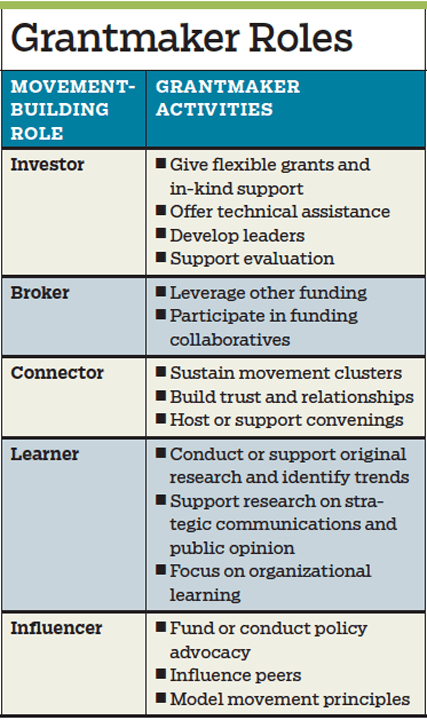 Grantmakers support movements in diverse and often interconnecting ways, from decades-long general operating grants to public opinion research to community leadership development efforts. Through most of these important activities, grantmakers occupy one of five roles: investor, broker, connector, learner, and influencer.1