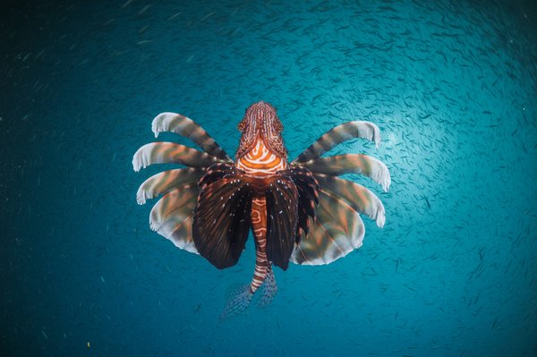 A beautiful, but deadly, lionfish swims in the India Ocean in the Ponta do Ouro Partial Marine Reserve, a 678-square-kilometer area that was created by the Mozambique government in 2009. The reserve is an important nesting area for the endangered leatherback sea turtle, the largest turtle in the world. The marine reserve abuts the iSimangaliso Wetland Park in South Africa, together forming one of Africa’s first transnational conservation areas. This photograph was taken by Thomas P. Peschak, a…
