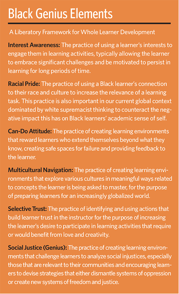 In fact there was a lot of research theory that aligned with their wisdom. For instance, Brené Brown’s research on vulnerability tells us that if a child can’t trust you, they can’t learn, love, or create in that environment.4 Even more, we know that if students are not interested in the instructional content, they cannot sustain the type of learning psychologists Edward L. Deci and Richard M. Ryan cite in their self-determination theory as necessary for tasks requiring sustained effort.5 Just as important, the need for Black history is well substantiated by a multitude of Black researchers who have outlined the importance of racial identity affirmation for Black children.6 Our team heard parents clearly say that their children did not deserve to be taught how to cope with racism; their children deserved liberatory learning environments that affirmed their humanity.