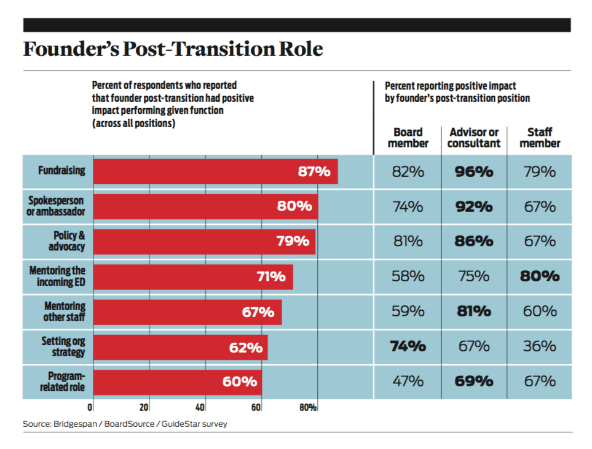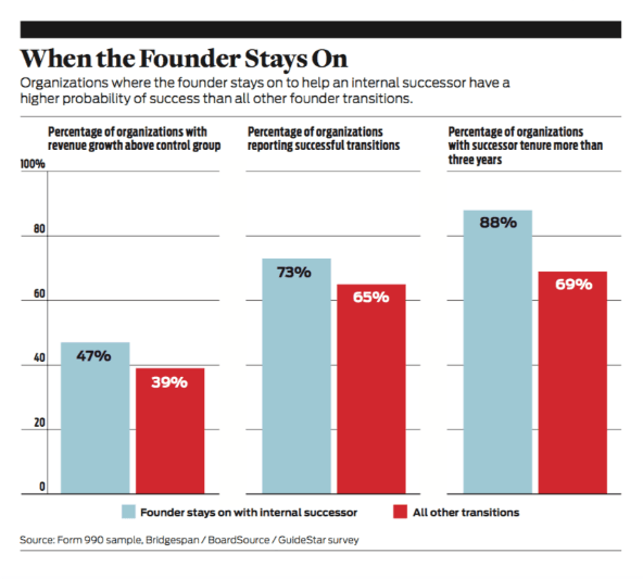 The results offered three valuable lessons. First, far more nonprofit boards work out a continuing role for founders (45 percent) than pursue an amicable clean break (31 percent). Moreover, among organizations where founders stayed, most reported that founders made positive contributions, and 75 percent thought the benefits of a continuing founder role justified the complexity. Nearly half of the organizations where the founder did not stay said the transition would have gone better had the founder played a role.