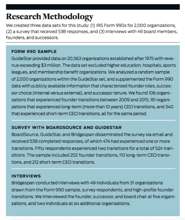 We conducted an in-depth, quantitative study of nonprofit founder transitions drawing on GuideStar’s IRS Form 990 database. A random sample of 2,000 organizations yielded 106 cases of founders transitioning. In addition, we joined with BoardSource and GuideStar to survey board members and nonprofit leaders, which resulted in 538 responses and 202 organizations that had experienced a founder transition. To get firsthand accounts of how founder transitions actually unfolded, we interviewed 49 individuals at 31 organizations about their experiences, including trios of founders, successors, and board chairs at organizations whose experience felt particularly instructive.