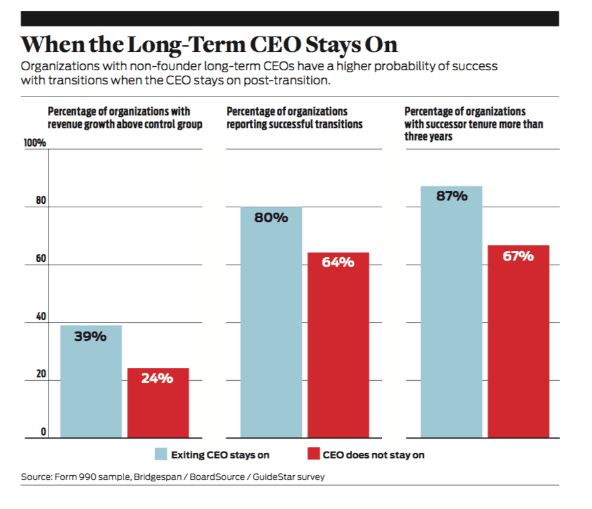 Second, transitions that paired a founder in a continuing role with a successor from inside the organization proved to be the most successful of all transition models we examined, based on revenue growth through the transition, retention of the successor, and self-reported performance. (See “When the Founder Stays On” below.) Examples from organizations large and small show the power of this model. What’s more, the same lesson holds true for non-founder long-term CEOs when they step aside: When they play an extended role post-transition, their organizations do better. (See “When the Long-Term CEO Stays On” below.)
