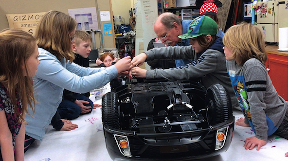 One group of students aged 8 to 13, working with a makerspace (a workshop where groups of people work together to make things) called Gizmo-CDA in Coeur d’Alene, Idaho, designed a car for a wheelchair-bound boy with cerebral palsy in their community named Barrett Limtiaco-Ruppel. The students spent six hours per week over two months fully customizing the car for Barrett. The final product sports a cushy seat positioned so that Barrett can extend his arms to grasp a front bar while strapped into the car, enabling him to sit upright despite his low upperbody strength. The car’s interior is padded with foam so that he does not fall out by accident.