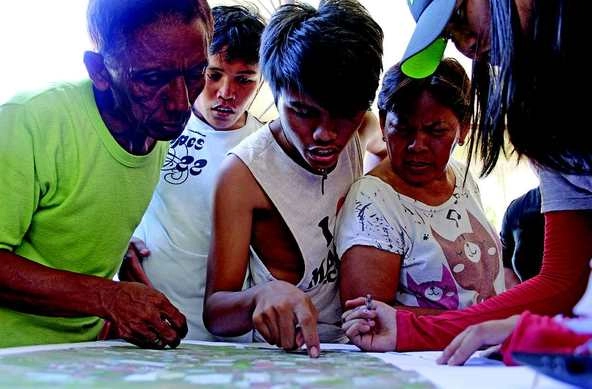 Local community members review aerial maps from a drone survey of the Philippines’ Cordova