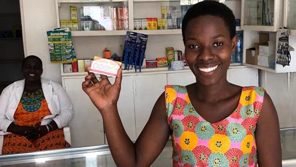 A drug shop owner receives self-test kits from researcher Moza Albert Chitela, co-packaged with specialized referral information to youth-friendly health facilities. Feedback from shop owners and employees informed low-fidelity program prototypes before investment in the final solution. (Photo by Lauren Hunter)