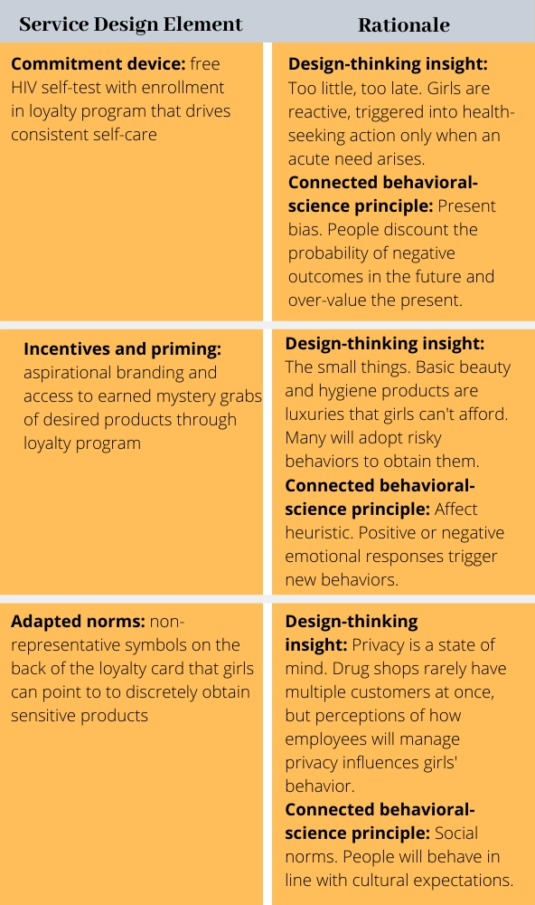Mapping design-thinking insights to evidence-based behavioral principles can reveal strengths and weaknesses in service design. This worked well in our past work to drive HIV treatment adherence using patient-centered approaches, and we’ve continued to employ this approach to broader, market-blocking norms. In Tanzania, we mapped our insights against common biases from behavioral science and the corresponding nudges to address them (see chart). This revealed that the loyalty program worked within girls’ reality, but added emotional appeal and fun to their routine trips drug shops. It also leveraged multiple strategies from behavioral science, including commitments (planning to complete an action), incentives (rewards for being a repeat customer), and social ties (a feeling of belonging as a program member). By using nudges to mitigate risk on the smaller aspects of behavior change—for example, encouraging repeat visits to the shop with positive reinforcement, and reducing the gap between intentions and actions via commitment devices—we could focus on the bigger, structural bets of introducing the product experience to the drug shop channel, such as breaking down gatekeeper norms and building trust between shop owners and young women. During a soft launch of our loyalty program, we found that more young women bought and reported using contraceptive and HIV testing products. We have since implemented a randomized experiment in four wards in Tanzania to more precisely measure its impact.