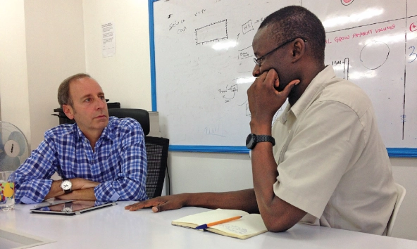 Doug Galen, cofounder of RippleWorks, meets in Nairobi, Kenya, with Dennis Ondeng, CTO of Kopo Kopo,