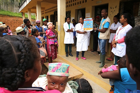 Members of Madagascar's Ministry of Public Health and PIVOT staff jointly address a group of patients about plague prevention as they await care at Tsaratanana Health Center in Ifanadiana District, Madagascar. (Photo by Peter Harris for PIVOT)