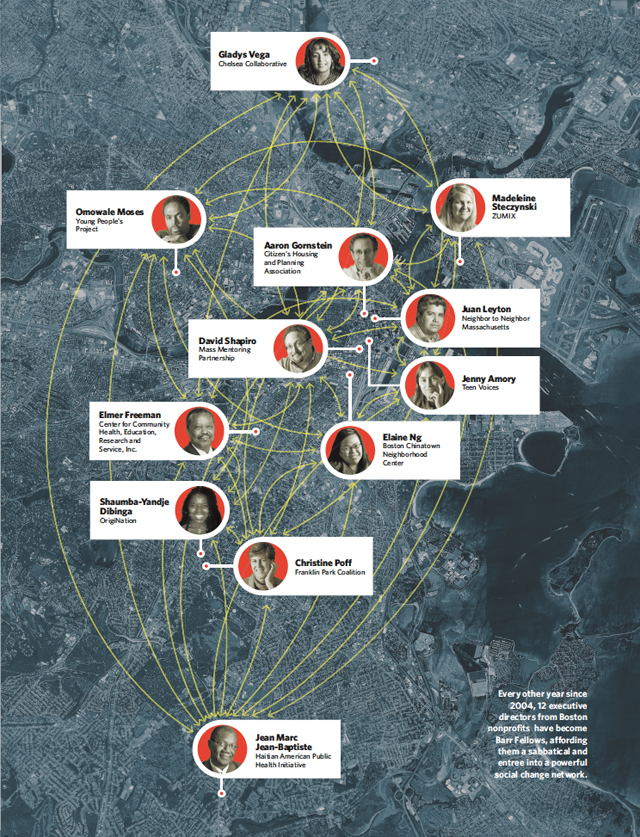 In the end, the primary learning from the Barr Fellowship Network is about the return on relationships. The trust and respect among Boston social change leaders has proved to be a currency for social change. As Casagrande remarks, “We’ve done one-off projects on a limited scale, affecting hundreds of people. Now we’re starting to do work affecting thousands of people, and we’re seeing the payoff in the investment of time, money, and resources to build this network. It’s taken that long to have real impact. It doesn’t happen overnight.” Brandes and the Barr Foundation are not afraid of slow change. “We have faith in these people,” she says. “We believe that by nurturing the well-being of mission-driven leaders and paying close attention to network health, we can transform the DNA of our sector in Boston. In so doing, we can carry forward Martin Luther King’s wisdom that ‘love is mankind’s most potent weapon for personal and social transformation.’”