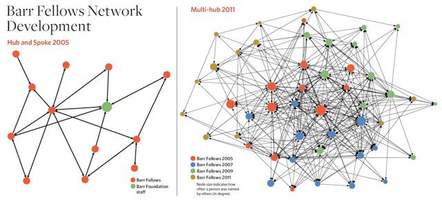 The Barr Fellows Network also drew upon a seminal paper by leading practitioners Valdis Krebs and June Holley, whose Building Smart Communities Through Network Weaving argues that healthy networks move from a centralized hub to connected clusters. Krebs and Holley caution that innovation comes from the periphery. This is the problem with old boys’ clubs. Though they are recognized as valuable sources of social capital, the homogeneity of such networks limits their potential for new ideas. The Barr Fellows Network would need to be intentional about reaching out to the margins and reinforcing its diversity, to avoid becoming elitist or insular. The “new social science of love” described by Michael Edwards, then a veteran Ford Foundation program officer, also resonated for strengthening ties among mission-driven leaders.