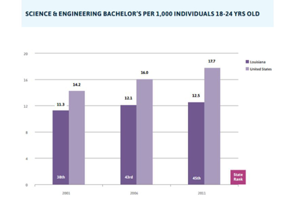 Economists have asserted that investments in human capital are far more important than any other factor for driving economic growth. But Louisiana’s policymakers have cut higher education funding by 42 percent since 2008. The state ranks 45th out of 50 when it comes to students majoring in science and engineering—the precise concentrations that the emerging water management industry will require (see below).
