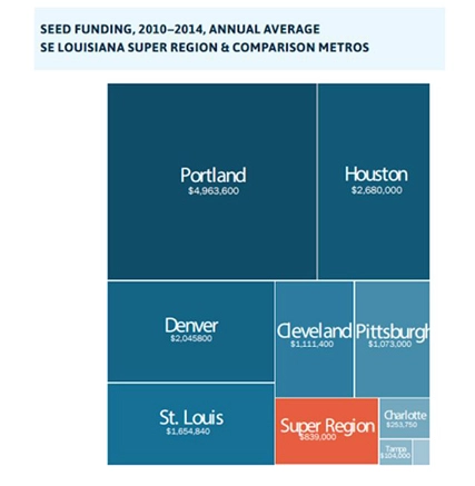 Support for research and development can also make or break Southeast Louisiana’s chance to transform its economic future. Private investment, especially venture capital, is a leading indicator of cluster growth. But the region pales in comparison to other metropolitan areas in terms of venture funding for local innovation (see below). Coupled with Louisiana’s weak federal and state funding for research and development, this seeming lack of interest in the region from private investment companies is a recipe for stifled innovation and squandered potential.