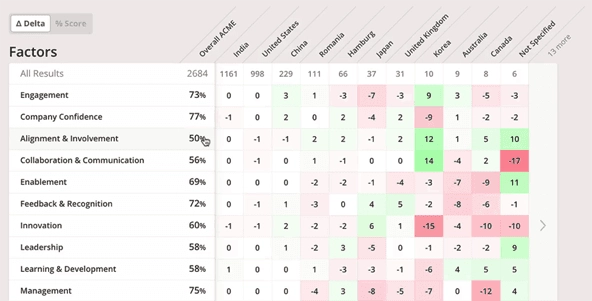 Culture Amp’s Heatmap report can show survey scores by country (great for multi-national organizations), department, team, gender, age, and tenure. Here we see the scores displayed by Delta (difference) from the aggregated scores.