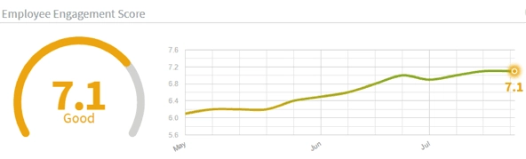 This Officevibe dashboard (not based on a real organization) is measuring 10 different metrics of engagement, including happiness. The score on the y-axis is average rating—with 10 as the highest—across those metrics. The x-axis is time.