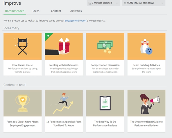 After measuring engagement, Officevibe’s Improve section offers managers tailored resources and tips.