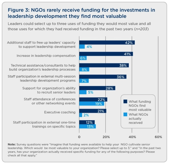 - NGOs have not prioritized time and resources toward investing in promising talent. Some 53 percent of the polled executives do not believe their organization is capable of developing effective leaders—a candid yet eye-opening concession.