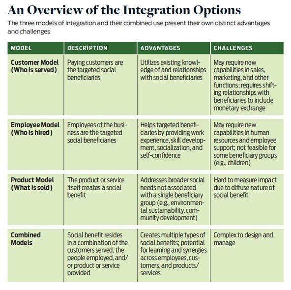 Combining more than one approach to integration can yield synergies between different areas of activity. Employing individuals from a given beneficiary group, for example, may help an organization learn about that population, ultimately making it easier to sell products or services to them. Selling a product or service with intrinsic social benefits may help reach new customer groups and expand the population benefiting from the nonprofit’s activities. In this way, combining models can help ensure that revenue generation and social benefits are mutually reinforcing. Yet, this approach also requires a higher degree of managerial sophistication, because multiple dimensions of change in the organizational model need to be juggled at the same time.