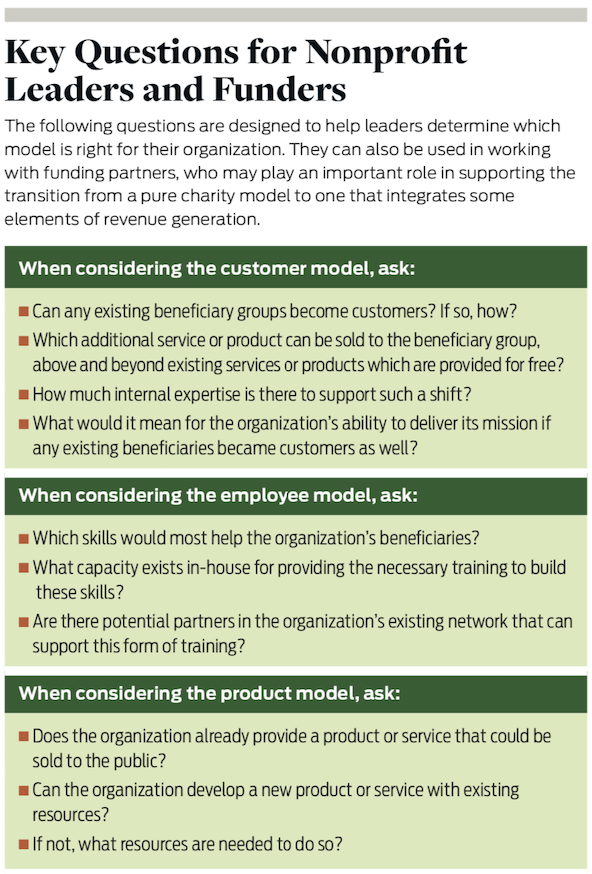 Although our research suggests three distinct models for nonprofits to integrate revenue-generation with their social mission, they are not mutually exclusive. In fact, it is increasingly common for nonprofits to combine multiple models. Organizations should choose an approach that fits their social mission and existing resources and capabilities. Let us consider the models in turn.