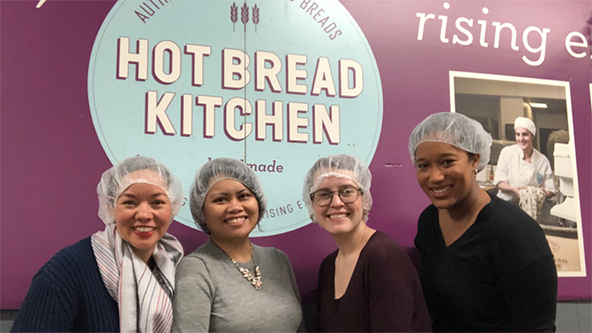 As part of the Yelp Foundation’s efforts to build meaningful relationships with grantees, board chair Miriam Warren (left) met with staff at Hot Bread Kitchen, a nonprofit social enterprise that creates economic opportunity through careers in food, in East Harlem.