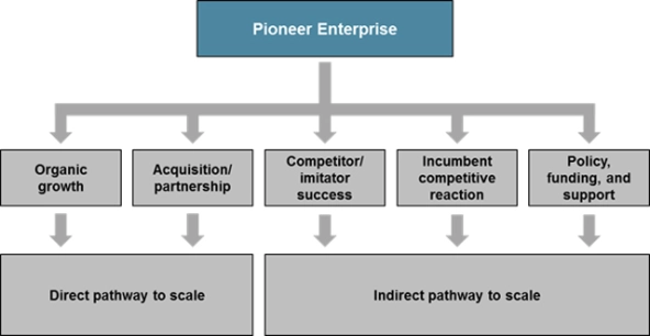 We believe that there are not only direct pathways to scale but also indirect pathways to scale—specifically, scale through the indirect inspiration or motivation of copycats and competitive responses that build on, extend, and sometimes even replace the initial pioneer. These alternative stories of scale involve systemic-level ripples or “pinballs” sparked by initial innovators; they lead to the creation or growth of “whole new markets” (as Clay Christensen recently described) and unexpected actors that serve the needs of the low- and lower-middle income segments.