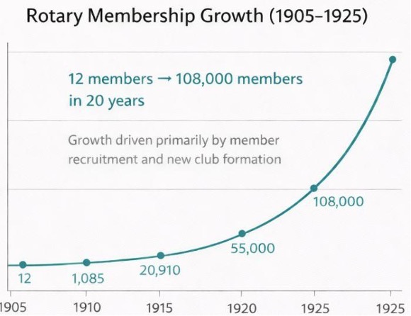 - Rotary International: “Role-embedded social transmission.” Between 1905 and 1925, Rotary grew from 12 members to more than 108,000, corresponding to an average transmission rate of roughly R ≈ 1.58 per year (meaning each generation of participants produced about 1.6 new participants). Rotary grew because the benefits of membership—professional networks, local prestige, civic identity, and regular access to business and community ties—made recruiting others a natural extension of participation. Existing members had a clear reason to invite new ones, and chapters provided a stable social structure that made replication relatively easy. Transmission can be embedded not only in therapy or formal obligation, but also in the social value of belonging.