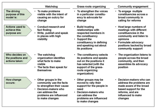 This diagram provides a comparison between the three different models for advocacy discussed in this article.