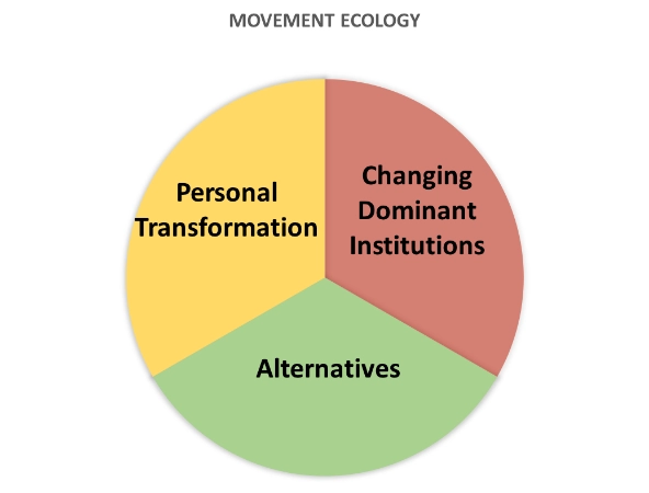 Across the movement ecology, people bring important capacities to the table, and through complex collaborations, they can achieve major social change victories. In this model, each of the wedges needs the others to win. But in practice, many people don’t see it that way. Groups and leaders regularly dismiss other slices of the ecosystem (inside-game people are “sell-outs,” for example, or personal-transformation people are “navel gazers”). This leads to movement fracturing and undercuts the ability of groups to collaborate in ways necessary to achieve the most significant changes. Understanding the ecology can help diagnose these conflicts and address them more effectively.