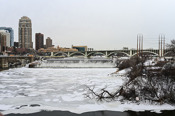 The frozen Mississippi River in downtown Minneapolis. (Photo by iStocķ/JoeChristensen)