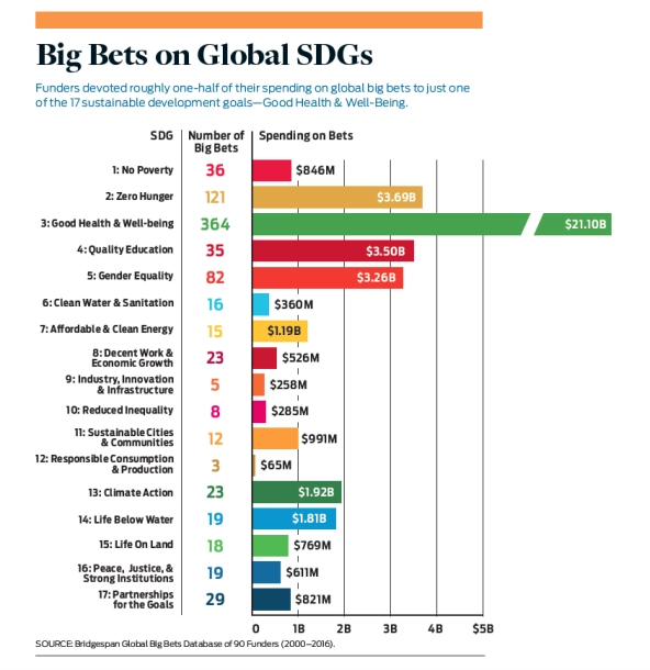 The $42.4 billion in big bets made between 2000 and 2016, however, flowed unevenly to the 17 SDGs. About half of the funding, $21.1 billion, went to a single SDG, number 3, Good Health & Well-Being. At the other end of the spectrum, seven of the goals, comprising roughly 40 percent of SDGs, collectively received $2.9 billion, just 7 percent of the big bet dollars.