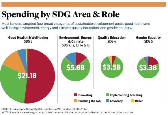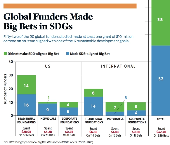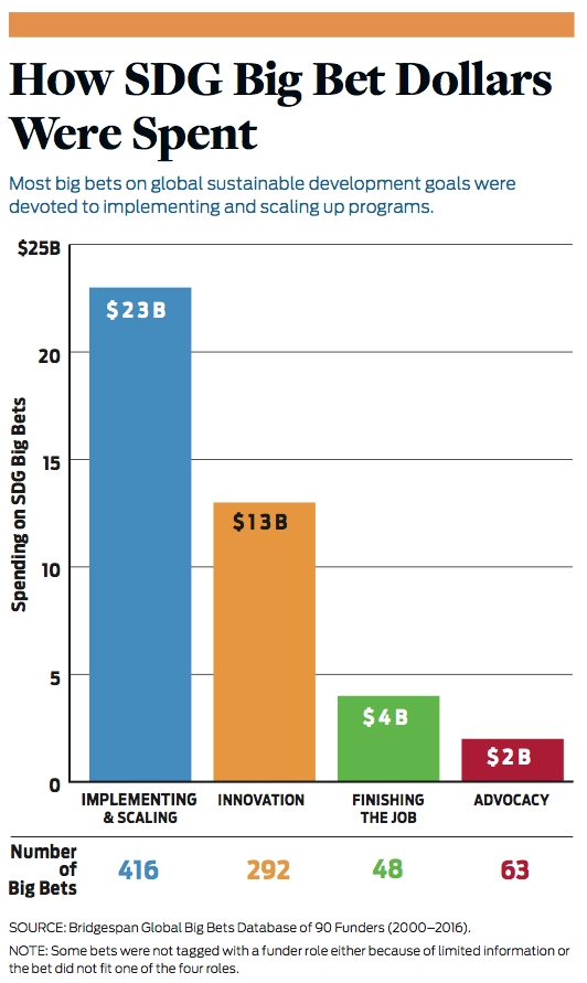- Developing and testing innovative solutions | Grants targeting innovations accounted for nearly a third of the $42.4 billion in SDG-aligned big bets. This is a role that other funders, such as governments or international development agencies, often are unwilling or unable to play given the uncertainty and risk inherent in innovation efforts.