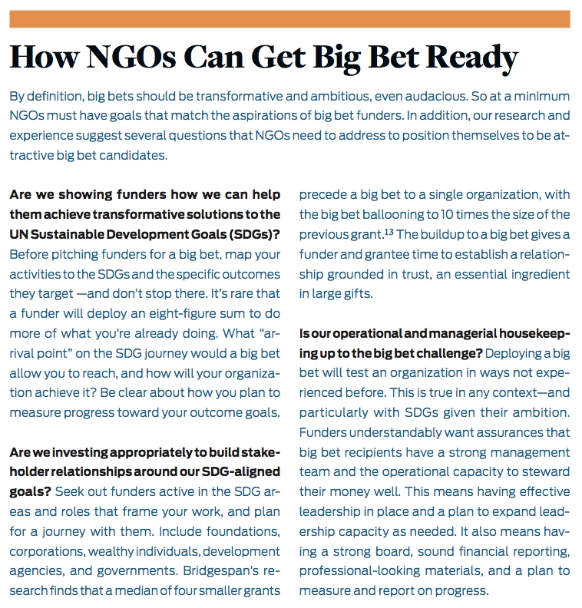 The world has never before aspired to achieve goals as ambitious and costly as the SDGs. If past is prologue, global philanthropy is prepared to invest tens of billions of dollars—often in the form of big bets—to make strides toward ending poverty, protecting the planet, and ensuring health and prosperity for all by 2030. While the journey has just begun, the international philanthropists we studied seem eager to bring their enormous resources to bear on these goals. More than ever, the world needs donors willing to think big, innovate, take risks, and build collaborations.
