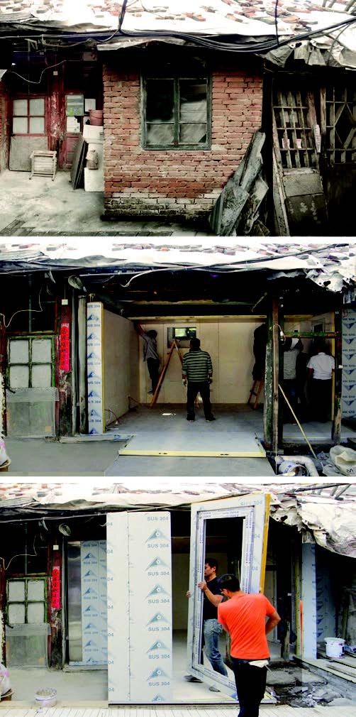 Workers install a “plug-in" for a Beijing hutong home. (Photograph courtesy of James Shen/ People’s Architecture Office)