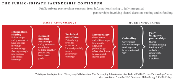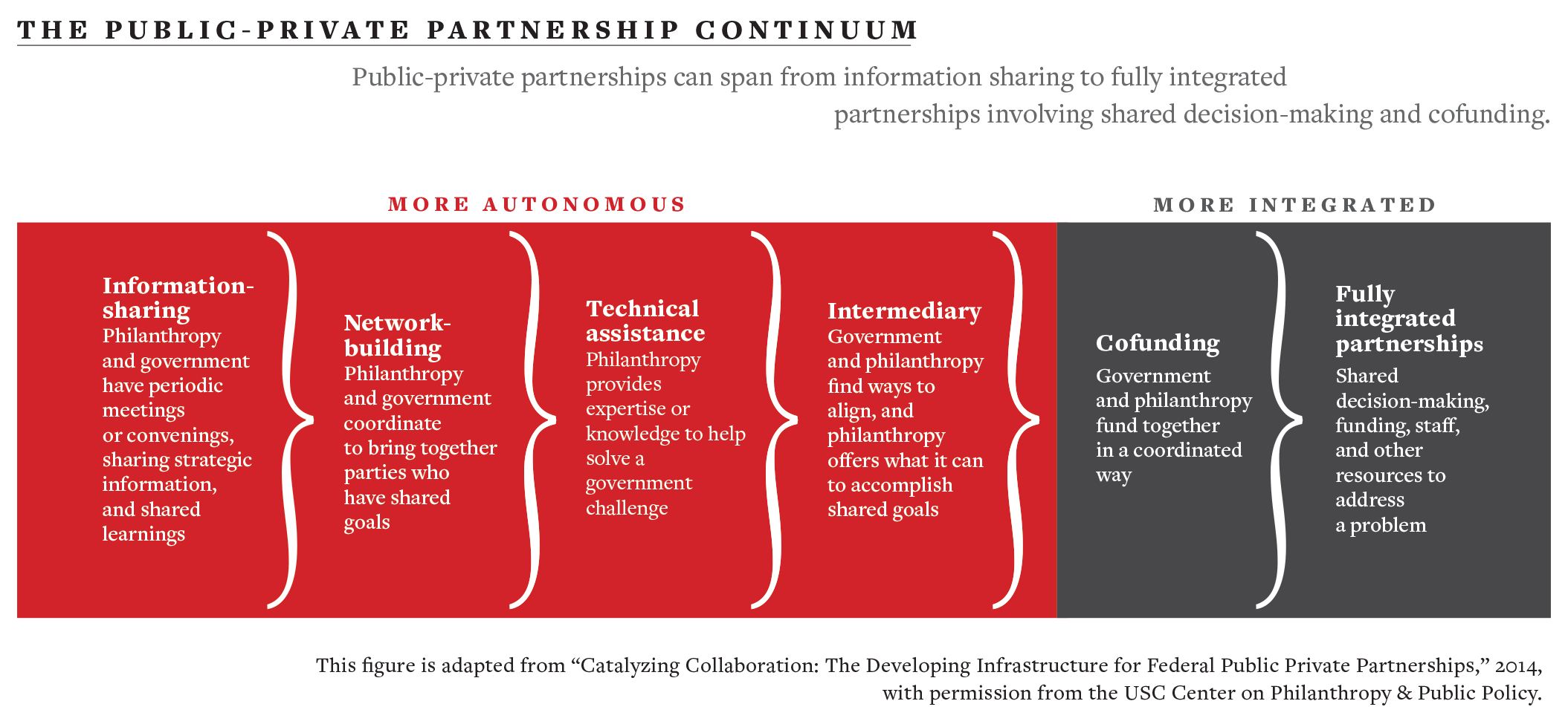 I define public-private partnership as a strategic relationship between government, business, philanthropy, and/or the nonprofit sector to solve social problems in a collaborative way. Such partnerships can take many forms that vary according to the nature of investment and involvement required from the government and the private sector. Some partnerships allow for greater autonomy, such as information sharing, while others are more integrated, such as coinvesting. Regardless of where a partnership falls on this continuum, it is always essential that public and private partners regularly communicate, share resources, and align strategically.