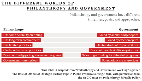 Despite the rise and success of public-private partnerships across all levels of government, they are not suited to every government problem. For example, certain functions, like providing basic social benefits, education, or public safety, should remain the responsibility of government. Additionally, commingling relatively small amounts of philanthropic capital—which, when invested alongside government programs, can be more flexible in purpose and more quickly deployed—with greater amounts of public dollars does not optimize the use of private funding. Instead, partnerships are best suited for leveraging less restrictive private-sector resources as risk capital to design and test new approaches that can then be quickly scaled by the government.