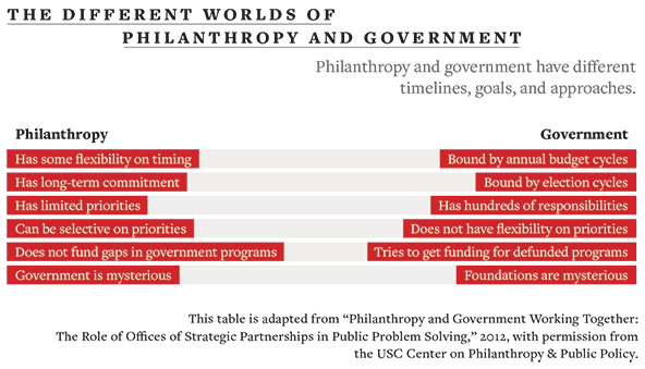 Finally, partnerships are not about finding private dollars to fill gaps in government funding. Rather, they aim to utilize the collective diversity of partners’ resources—from expertise to funding to coordinated communications—to align on policy and programming for greater impact.