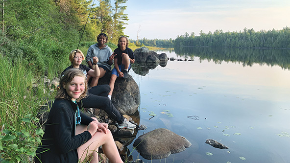 LGBTQ+ youth sit in the Boundary Waters Canoe Area, in Minnesota’s Superior National Forest, in August 2022. (Photo courtesy of QUEERSPACE Collective)