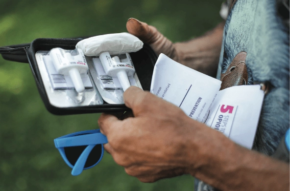 The device doesn’t have a visible needle, so it’s less intimidating to non-medical professionals. And in the politically conservative Southern county, the less a program conjures stereotypes about drug use, such as needles for shooting up, the more likely it will go over well with local lawmakers and authorities.