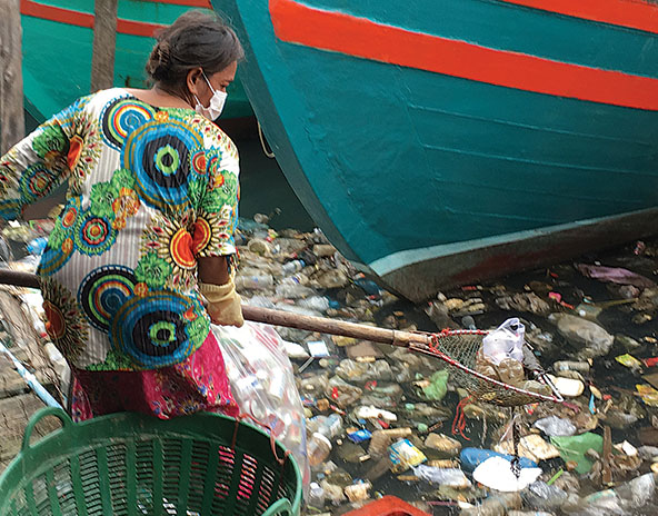 TONTOTON waste picker Sorn SreyMom collects orphan plastics for cement conversion in Sihanoukville, Cambodia. (Photo courtesy of TONTOTON)