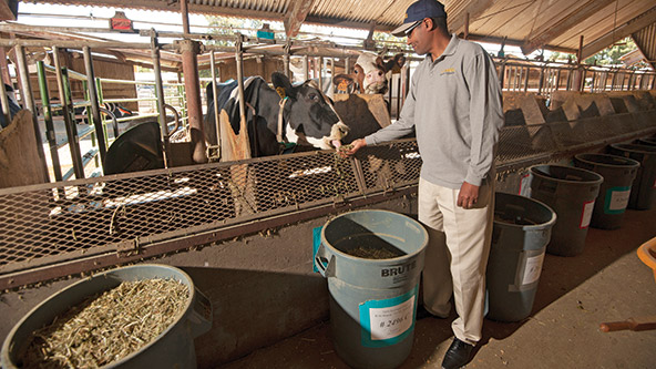 UC Davis professor Ermias Kebreab conducts research with 12 dairy cows to determine if a small amount of seaweed added to cattle feed will reduce methane emissions from cows. (Photo courtesy of UC Davis Strategic Communications)