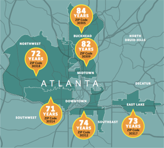 In Atlanta a person’s ZIP code is often the biggest predictor of his or her health status. The region’s staggering health disparities were made clear in a map released by Virginia Commonwealth University and the Robert Wood Johnson Foundation in 2015 that vividly shows how short distances can translate into large differences in health. (See “Short Distances to Large Gaps in Health” below) In some Atlanta communities people are expected to live 84 years, while just a few miles away life expectancy is only 71 years.