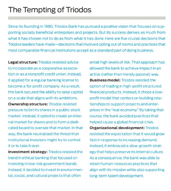 The story of Triodos is that of a “positive outlier” within the financial services industry. It is the story of leaders who decided, again and again, not to dance to the “music” that has long guided the executives at most mainstream banks. The leaders of Triodos have, over the course of its history, confronted and resisted a series of temptations—a series of pressures and opportunities that other banking leaders have generally been unable to resist. (See “The Tempting of Triodos” below.)