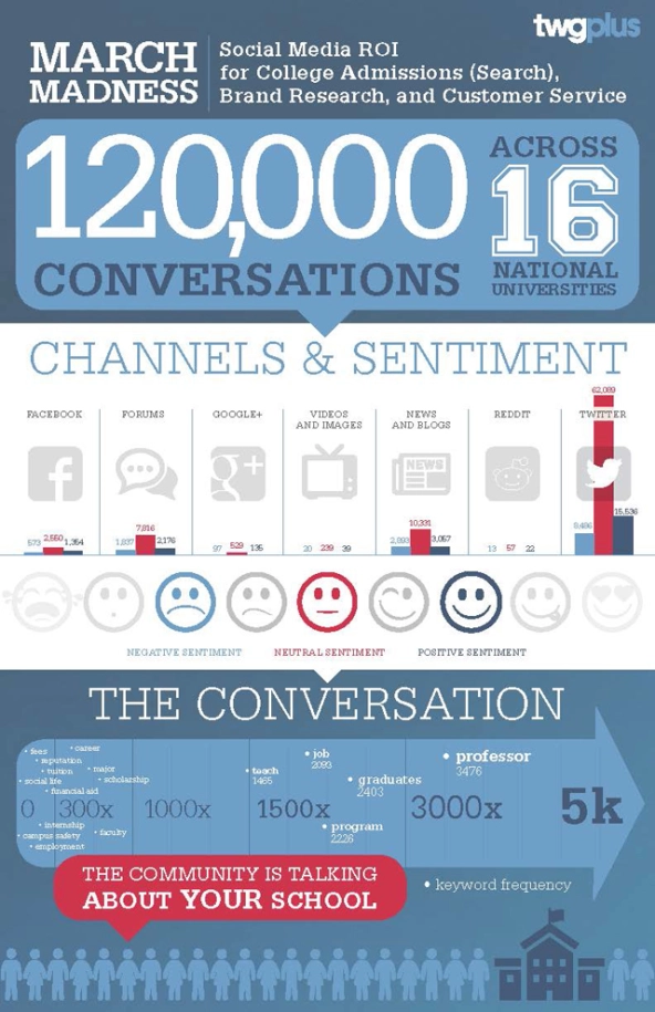 I am a higher education marketer who helps college and university professionals attract more and/or different types of students. For many institutions of higher education (the non-elite schools), this is no small feat. I decided to utilize social media monitoring and text analytics to get a better sense of what people were saying about some of the top-ranked institutions in the United States, including Harvard, Yale, Stanford, and the University of Michigan. Setting up social media monitoring software to search for school names, Twitter handles, and athletic mascots, I collected and analyzed approximately 120,000 conversations on social networks and other online channels from March 1 to April 15, 2013. March Madness and the height of the college admissions season fell within this time period. Therefore, I expected to see a lot of online discussion focused on the college choice process and important variables associated with selection, as well as on school spirit surrounding the basketball tournament. I specifically sought to identify and learn about conversations around the critical issues facing higher education, such as cost, academic quality, and campus safety. I also focused on providing concrete strategies to higher education marketers who are attempting to sell their institutions to prospective students. (View a report that discusses the methodology, findings, and implications here.)