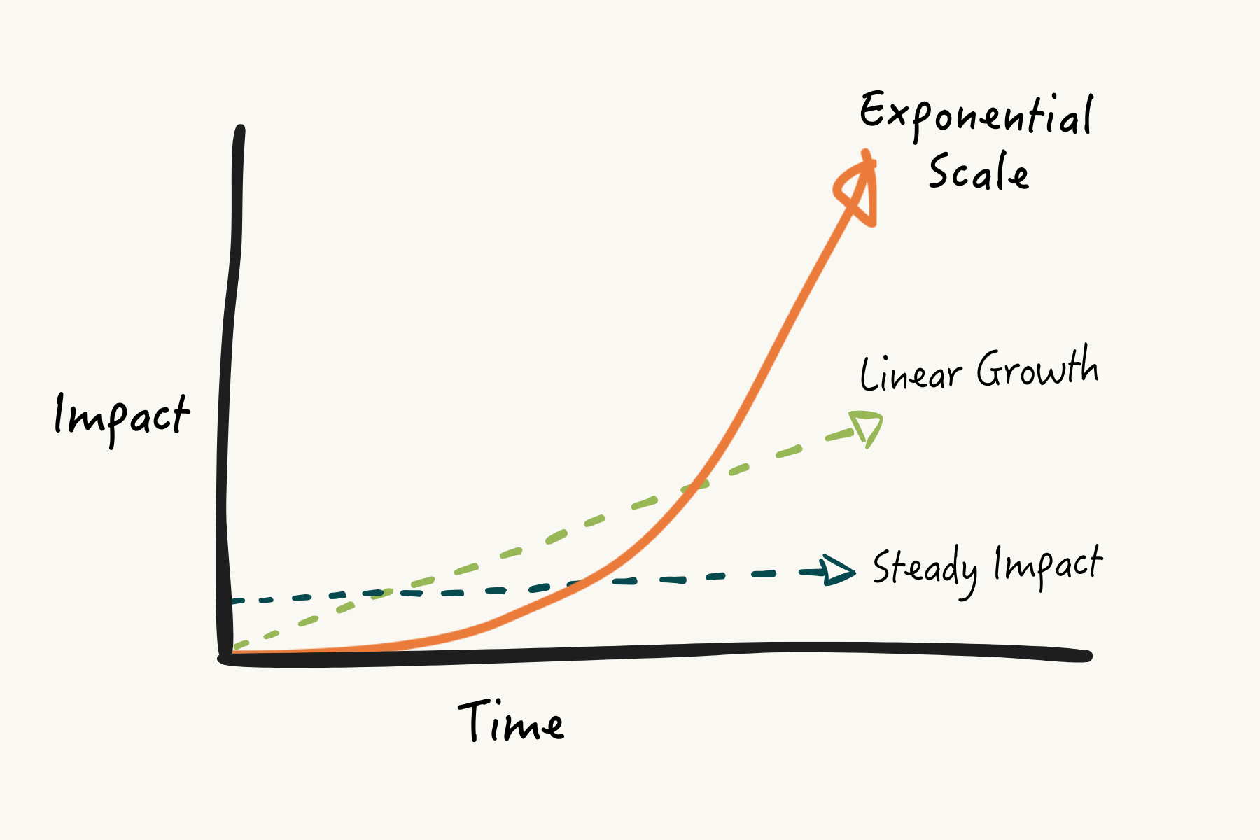 I could go on with examples like this all day, but you can see how the need quickly outstrips the capacity of philanthropy (not to mention its attention span). With linear growth, big ambitions drive ballooning budgets and rev up the fundraising hamster wheel. You can do a lot of good, but you can count on hitting a funding ceiling long before you’ve made a big dent in a big problem.